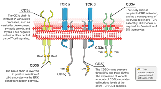 T细胞,全称T淋巴细胞,是一种特殊类型的白细胞,在外周血中约占淋巴细胞总数的65% ~ 75%,由来源于骨髓的造血干细胞在胸腺中分化并发育成熟后,通过淋巴和血液循环而分布到全身的器官和组织中发挥免疫功能,T细胞是适应性免疫系统中的关键组成部分。T细胞具有独特的表面受体,被称为T细胞受体(T cell receptor,TCR),常以异二聚体的形式存在(90%以上的TCR由α链和β链组成,约5%的TCR由γ链和δ链组成),它能够特异性识别抗原并介导免疫反应,在调节 T 细胞迁移、分化和成熟方面起着决定性作用,由于 TCR 的胞外段非常短,无法自行完成信号传导,因此 TCR 需要一个辅助分子,而 CD3(Cluster of Differentiation 3)即承担了这一角色,CD3是T细胞膜上重要的生物标志物,由四个蛋白链亚基(CD3γ、CD3δ、CD3ε和CD3δ)组成,CD3通过非共价键与 TCR 结合形成 TCR-CD3 复合物,TCR-CD3 复合物是 T 细胞特异性识别抗原并传导信号的分子基础[1]。