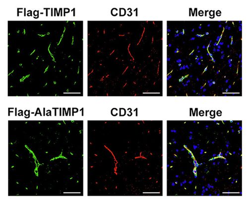 图5是客户使用汉恒生物提供的跨血脑屏障血清型AAV-BR1血清型过表达TIMP1或者AlaTIMP1基因。尾静脉注射小鼠AAV-BR1-TIMP1-Flag或AAV-BR1-AlaTIMP1-Flag两周后,通过Flag(绿色)和内皮细胞标记物CD31(红色)的免疫荧光染色分析目的基因在脊髓皮层中的表达情况[13]。