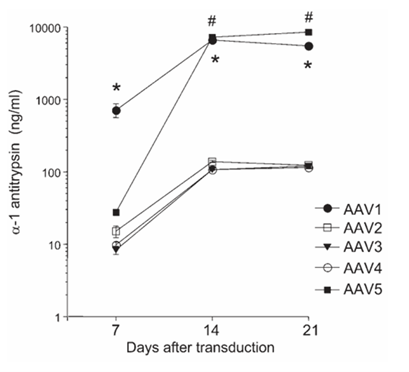 在内皮细胞靶向的早期研究中,体外实验发现,AAV1 和 AAV5 血清型相对于 AAV2 具有更高的内皮细胞转导效率。AAV1在转导后7天表现出最高的转导效率,AAV5 载体在第14天和第21天表现出更强且更稳定的表达水平,甚至超过了AAV1。因此,AAV5血清型被认为是对血管内皮细胞具有较好的嗜性[12]。