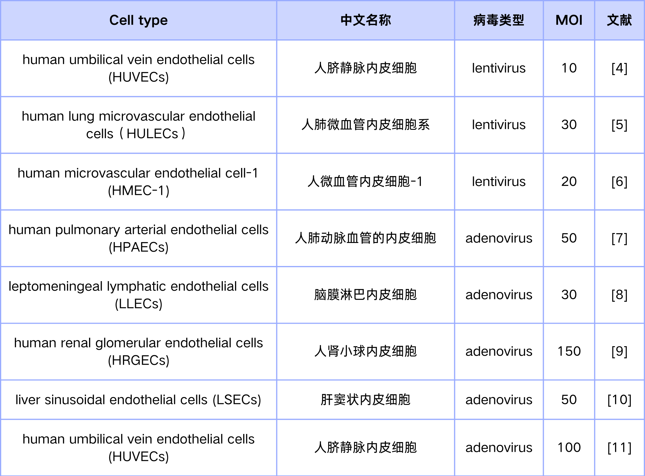 体外实验中常用到原代内皮细胞和永生化的内皮细胞系,一般都是单一细胞,感染过程中不需要考虑表达特异性的问题,更多的是考虑后续实验的需求。作为常用的基因表达调控工具,慢病毒(LV)、腺病毒(ADV)对于各种内皮细胞均有较好的感染效率。慢病毒感染细胞后目的序列会整合到宿主基因组上,可以稳定传递,因此,若需要构建稳定表达细胞株时,推荐使用慢病毒。慢病毒对于原代细胞的感染效率不佳,并且容量有限,因此对于很多原代细胞或编码序列较长的基因,慢病毒常难满足需求,而腺病毒的特点则完美互补了这一缺陷。对于大多数原代细胞而言,腺病毒有更好的感染效率,并且腺病毒基因组较大,通过改造后的重组腺病毒能容纳更大的外源插入序列。因此只要选择恰当的病毒工具,并配合适当的感染条件,在细胞水平上实现内皮细胞的基因表达调控不是难事。这里,我们也根据汉恒生物客户发表的文章整理了部分内皮细胞感染所选择的病毒种类与采用的最佳感染复数(MOI)供大家参考(表1)。