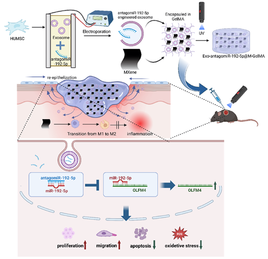 2025年6月11日,海军军医大学夏照帆院士团队在《Bioactive Materials》(IF=20.3)上发表题为“AntagomiR-192-5p-engineered exosomes encapsulated in MXene-modified GelMA hydrogel facilitated epithelization of burn wounds by targeting OLFM4”的研究论文。本研究通过高通量测序筛选发现miR-192-5p在氧化应激的人永生化角质形成细胞(HaCaT细胞)模型和烧伤创面组织中显著上调,并证实其通过抑制OLFM4的表达而损害HaCaT细胞的增殖、迁移能力并促进细胞凋亡。接着,研究团队成功构建了负载antagomiR-192-5p(ant-192)的工程化外泌体(Exo-ant-192),并进一步将其封装于由GelMA和MXene纳米片组成的复合水凝胶中,开发出多功能敷料Exo-ant-192@M-Gel。该体系不仅实现了ant-192的持续释放和延缓降解,还展现出显著的抗炎特性,有效改善了烧伤创面微环境并加速上皮化进程。该治疗策略通过miR-192-5p/OLFM4轴显著促进表皮细胞功能,为烧伤创面愈合提供了新型靶向治疗方法和药物递送平台。